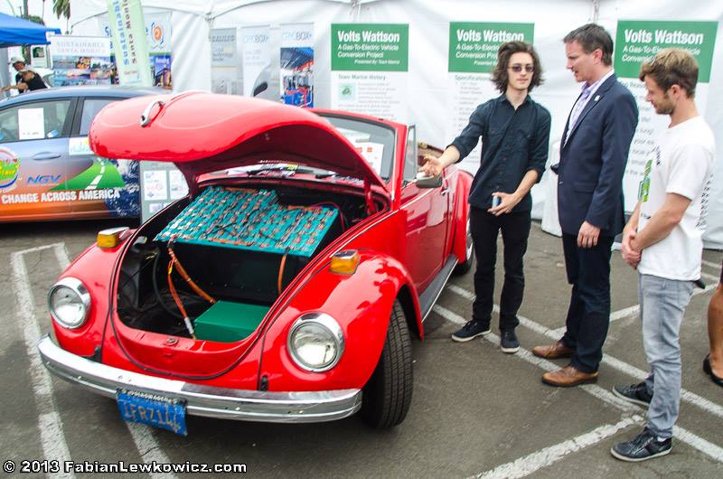 For the past four years we have been working on the conversion of a 1971 Volkswagen Super-Beetle (donated to us by the Poon-Fear family in 2009) from a combustion engine into an all-electric vehicle. On September 20th and 21st we had the debut of our car “Wattson” at the Santa Monica Civic Center for the Alt-Car Expo. This two-day event was filled with entertaining interaction and education. Alt-Car Expo gave us the opportunity to turn our car into a “lesson plan on wheels”. We were able to teach people about the effects of combustion engines in our environment and health as well as showing our conversion process and techniques. We also got to learn a lot and share thoughts with the other electric car companies that were in the event. It was very pleasing to see how thrilled everyone was to learn about our car and the benefits of electric cars. Even toddlers liked our car (image below)! Thank you to all the supportive people at the event including Christine Dzilvelis for coordinating, Rick Sikes for managing the City of Santa Monica,and Roy Persinko, Fabian Lewkowicz, and Valerie Macon for their beautiful photography. A very special thanks to Alt-Car Expo for giving us this wonderful opportunity to debut our all-electric car.